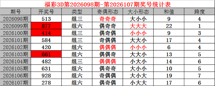 上期回顾:福利彩票3D第2026107期开奖结果278。奖号:偶奇偶、小大大,和值17,跨度6。
