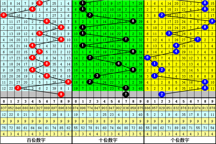 百位:上期奖号为:2,该位大小 号走势趋于平衡,上期下降7点,本期预计该位上升,参考号码8。